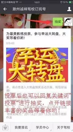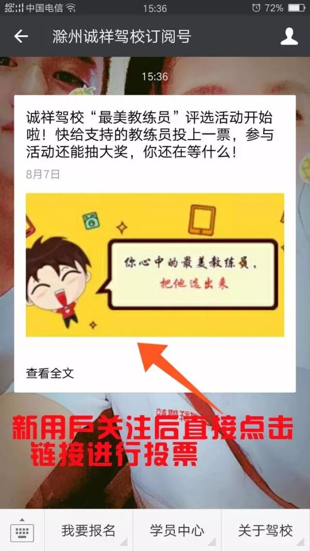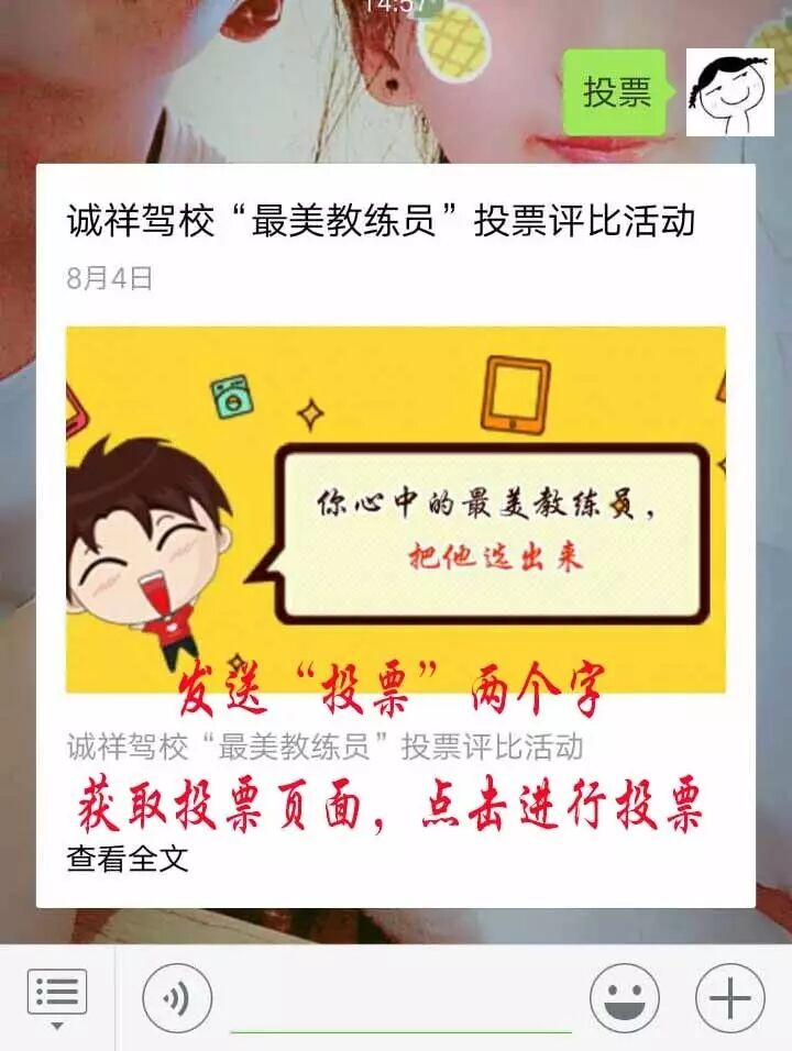1、新用户关注“诚祥驾校订阅号”或扫描下方二维码直接关注后,会弹出投票链接,点进去就可以投票啦!老用户直接在公众号回复“投票”两个字,点击回复的链接进行投票!
